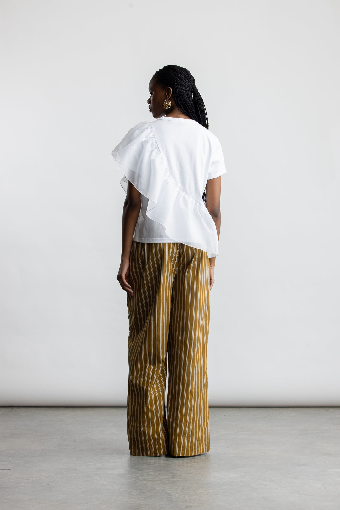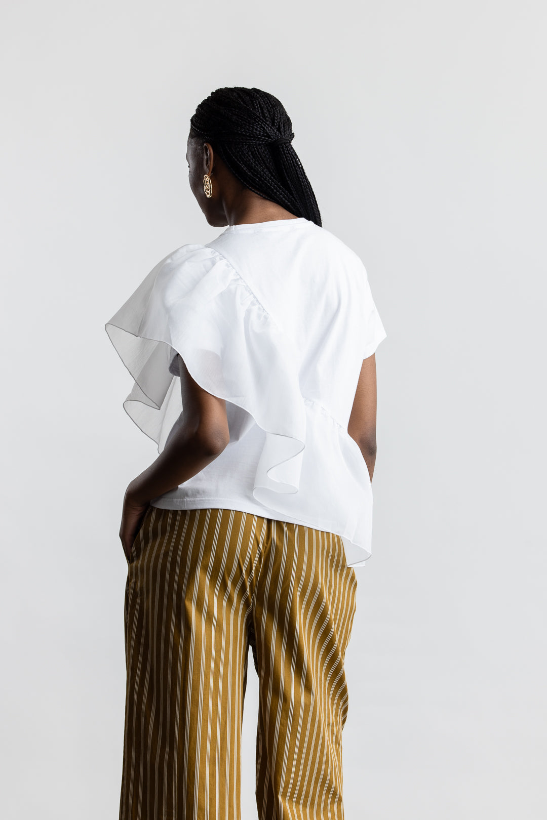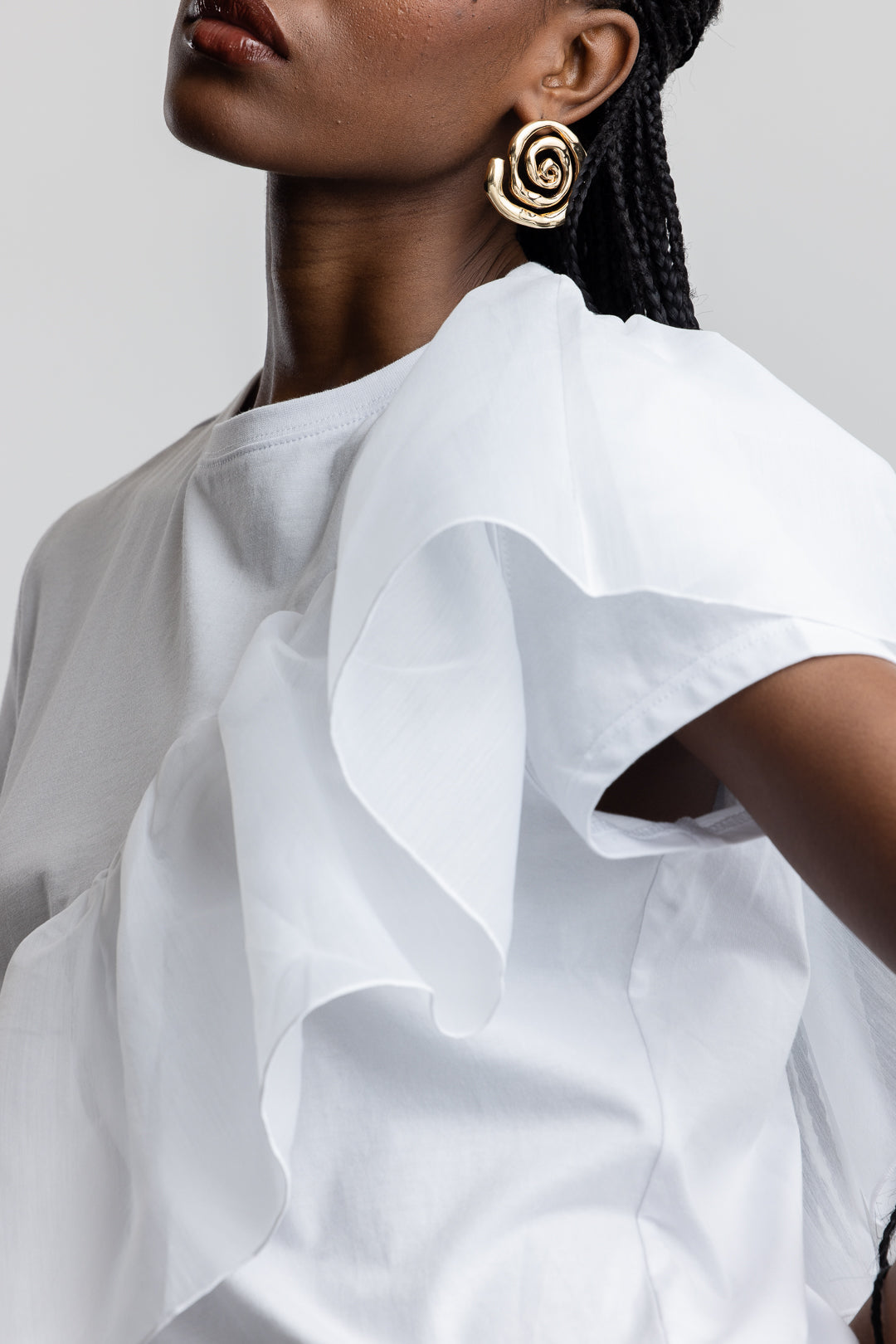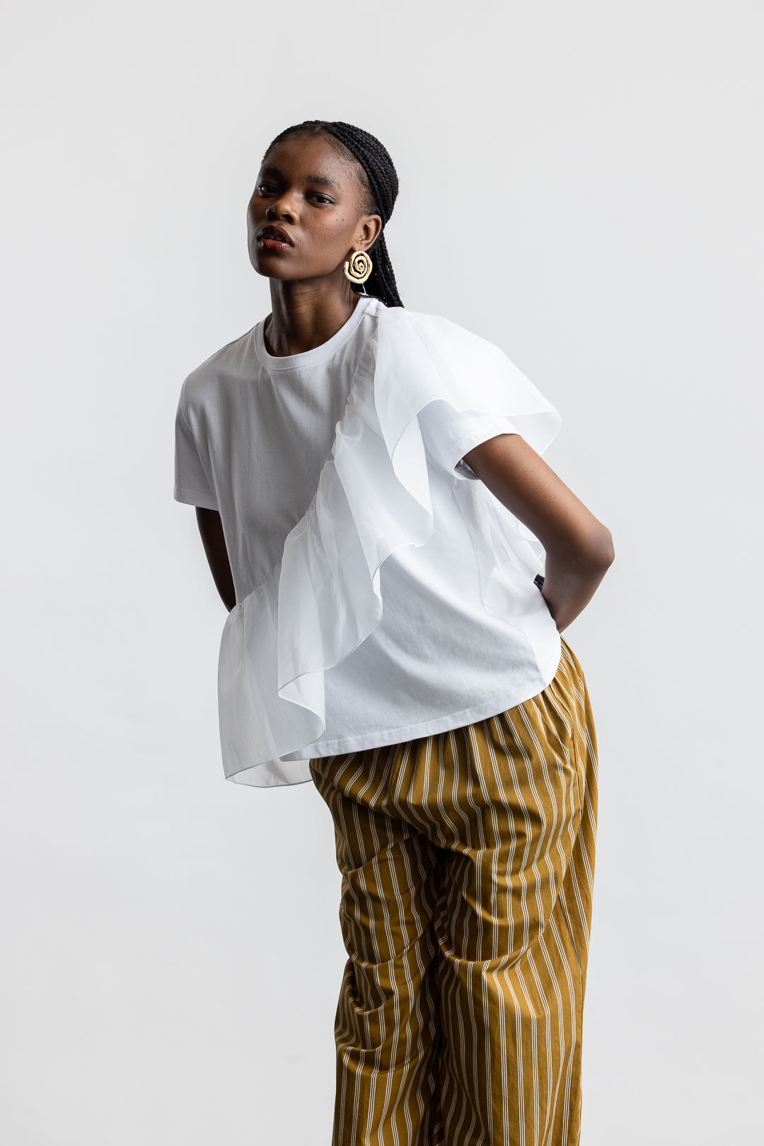 This statement top redefines the classic tee with a bold, sculptural twist. Crafted from a soft cotton base, it features a dramatic, asymmetric ruffle in a contrasting sheer fabric that sweeps diagonally across the front and over one shoulder. The combination of crisp tailoring and fluid movement creates a striking play on texture and shape. Perfect for day-to-night styling, pair it with tailored trousers or a sleek skirt for an elevated look, or wear it with denim for a modern, high-low mix.