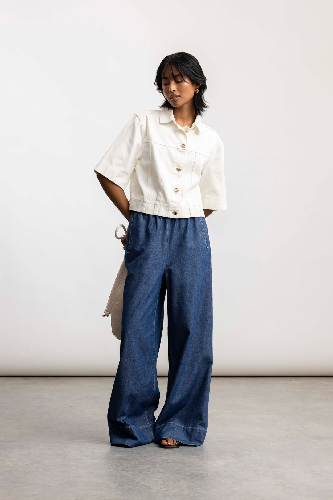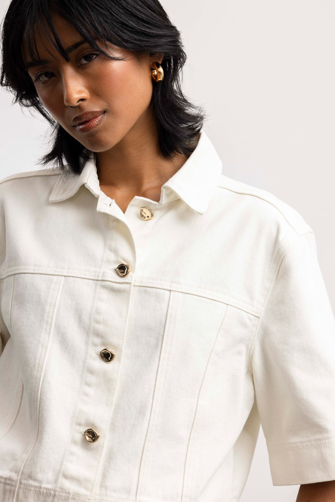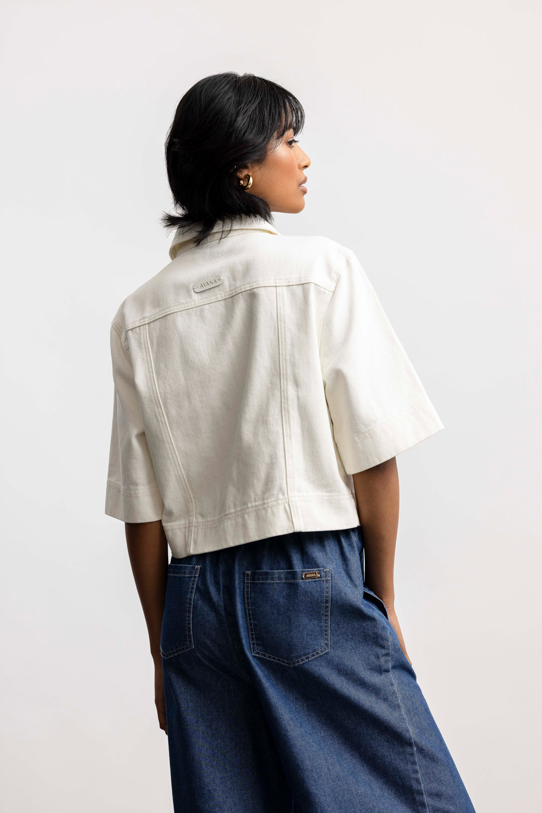 Crisp and contemporary, Our Solene cropped denim jacket reimagines classic denim inspired tailoring in a fresh, minimalist form. Crafted from structured cotton twill, it features a clean cropped silhouette, sharp collar, and wide half sleeves for a relaxed yet polished proportion.